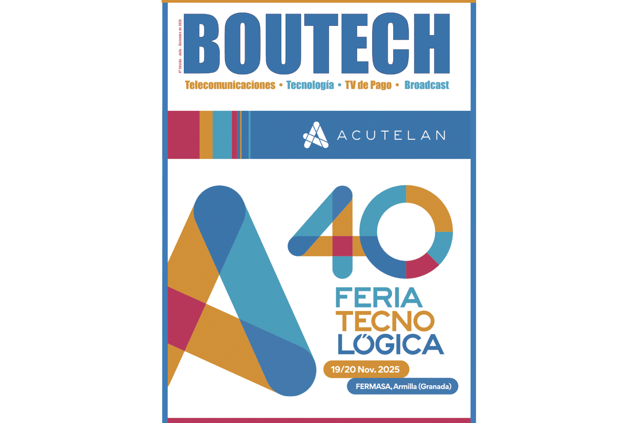 Esta edición especial está dedicada a la 40ª Feria Tecnológica de ACUTELAN, de la que Boutech es revista oficial. El número recoge las últimas novedades de la nueva patronal ACUTELAN, y su papel como punto de encuentro de referencia nacional para operadores, instaladores, fabricantes y televisiones locales.